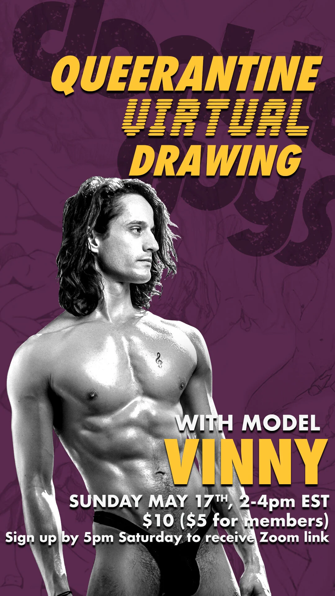 Join us via Zoom this Sunday from 2-4pm EST for a virtual figure drawing session with the sexy Vinny! We are excited to provide a weekly space to gather an international group of artists together to get creative during these crazy times.